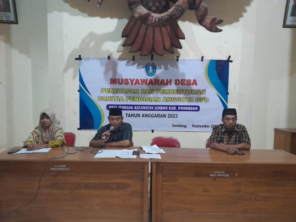 bertepatan tanggal 07 september 2023 , dengan menjelangmnya masa berakhirnya masa jabatan BPD di desa sendang di tahun ini, maka di adakan musdes pembetukan panitia pengisian BPD, dalam musdes di hadiri tokoh masyarakat RT, RW dan BPD serta seluruh perangkat desa memurut Bapak Muyadi selaku ketua BPD sekarang beliu mengatakan bahwa masa jabatan nya sebagai mitra desa / pengawas desa pada tahun 2023 ini akan segera berakhir di bulan november di tahun 2023, makan meuruk ketentuan perbub bupati semua desa yang masa BPD berakhir ditahun ini harus segera membuka lowongan BPD dan di umumkan kemasyarakat umum di desa masing – masing. untuk penguman pengisian akaan di umum kan seseger mungkin, untuk desa sendang yang katagorinya desa maju , untuk batasan minimal harus tamatan SLTA/ Sederajat. dan untuk persyaratan yang lebih jelas bisa tanya ke sekertariat pengisia BPD di balai desa sendang.